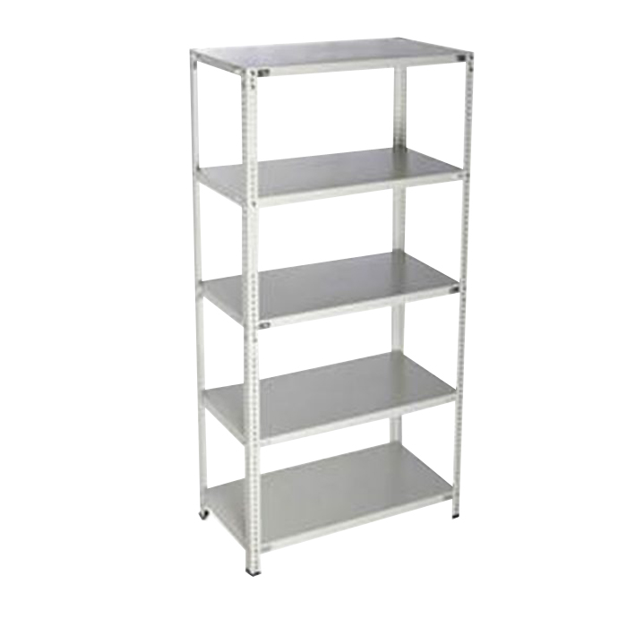 Estantería metálica mecano de acero inoxidable, con 5 niveles de bandejas lisas movibles. Con patines plásticos.