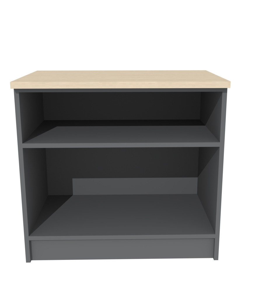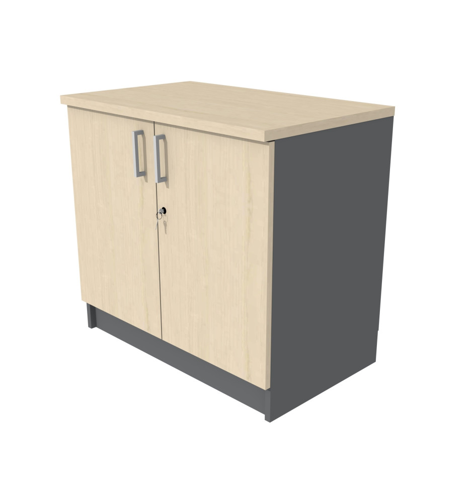 Mueble Armario Gabinete, con puertas batientes, estructurado en Mdf 18mm Melaminico. Cubierta en Mdf Melaminico en 24mm. Cantos en Pvc. Con tiradores metálicos y cerradura tambor. Con patines plásticos. Color Grafito/Maple.