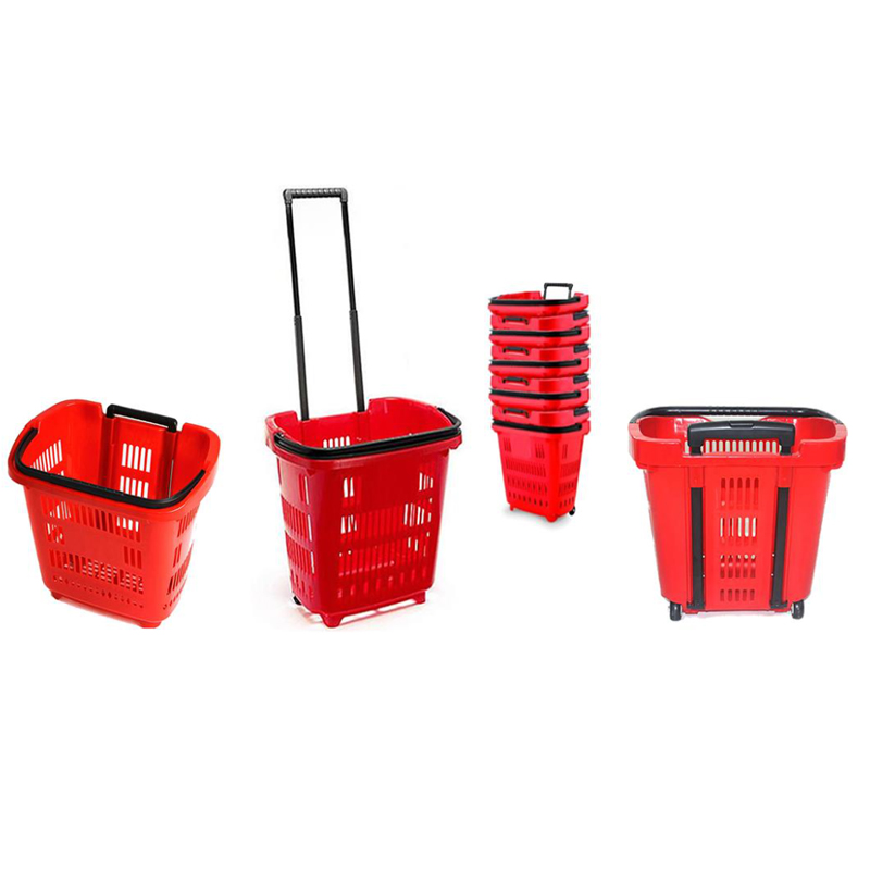 Canasto Plastico de alta densidad con ruedas, Mango y manillar extensible. Capacidades 34 Lts. Colores, Rojo / Azul / Verde