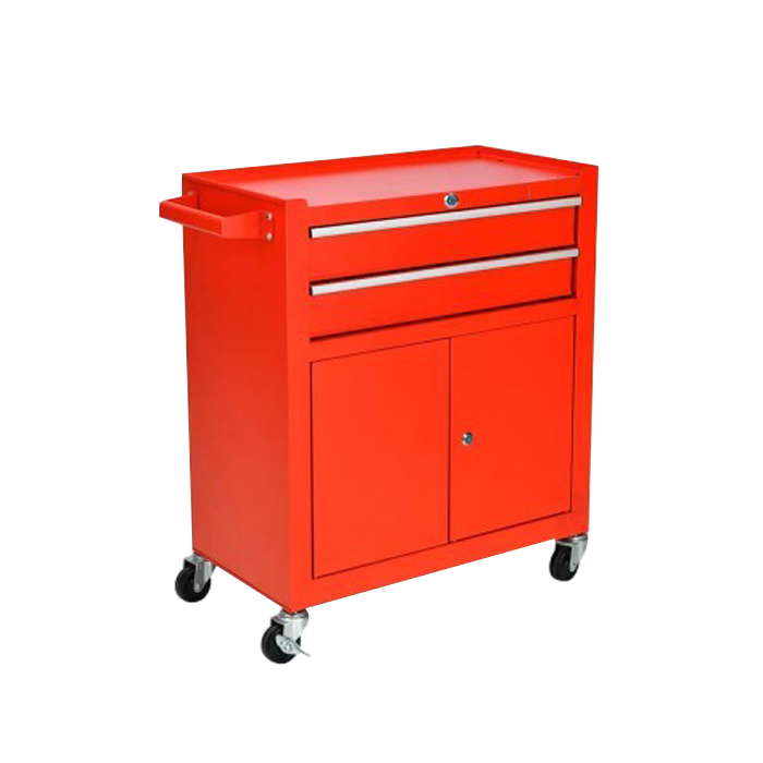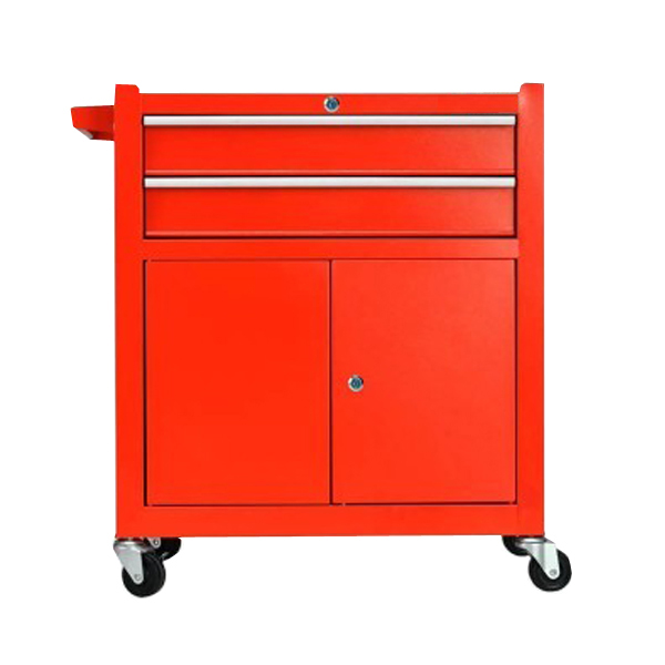 Carro Portátil Organizador para herramientas de trabajo con gabinete inferior con llave, con 2 cajones con llave tipo trampa. Fabricado en Acero, carga Total: 100 Kilos, con 4 ruedas. Con manillar asa para el traslado. Color Rojo