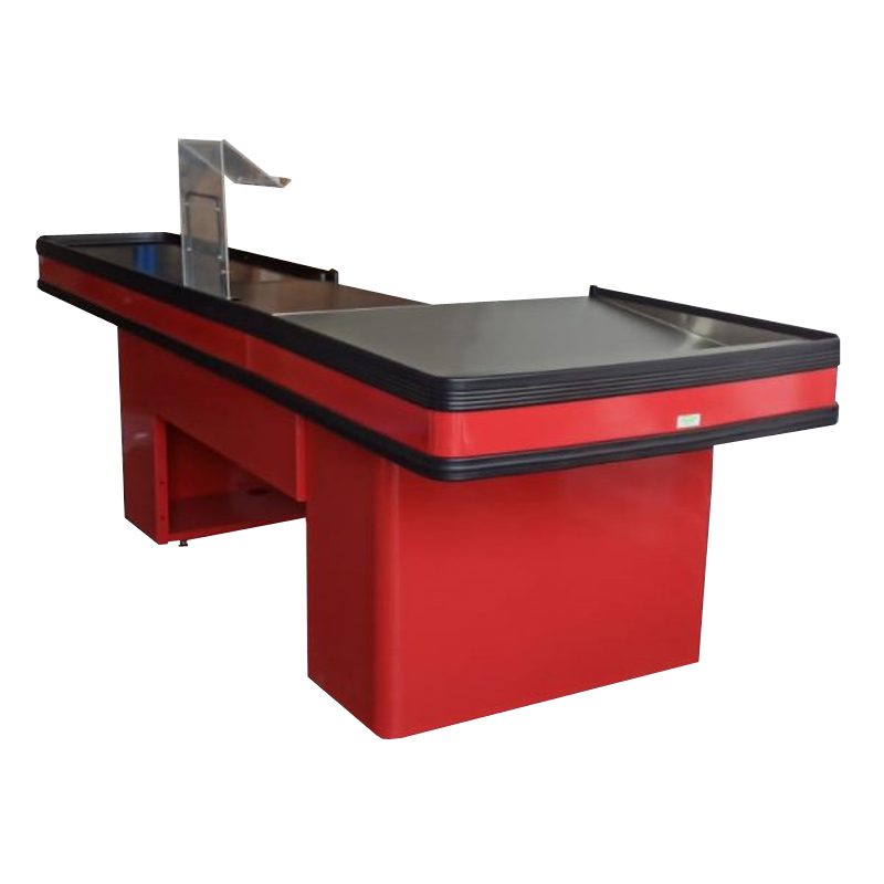 Check Out Motorizado Riñón con cinta transportadora de mercadería. Con bandeja de salida Riñón Inclinada de acero inoxidable, estructura autosoportante de acero pintada en color Grafito / Rojo / Blanco. Con bandejas interior, con mesón sector caja, con niveladores. Origen Argentina ![]()