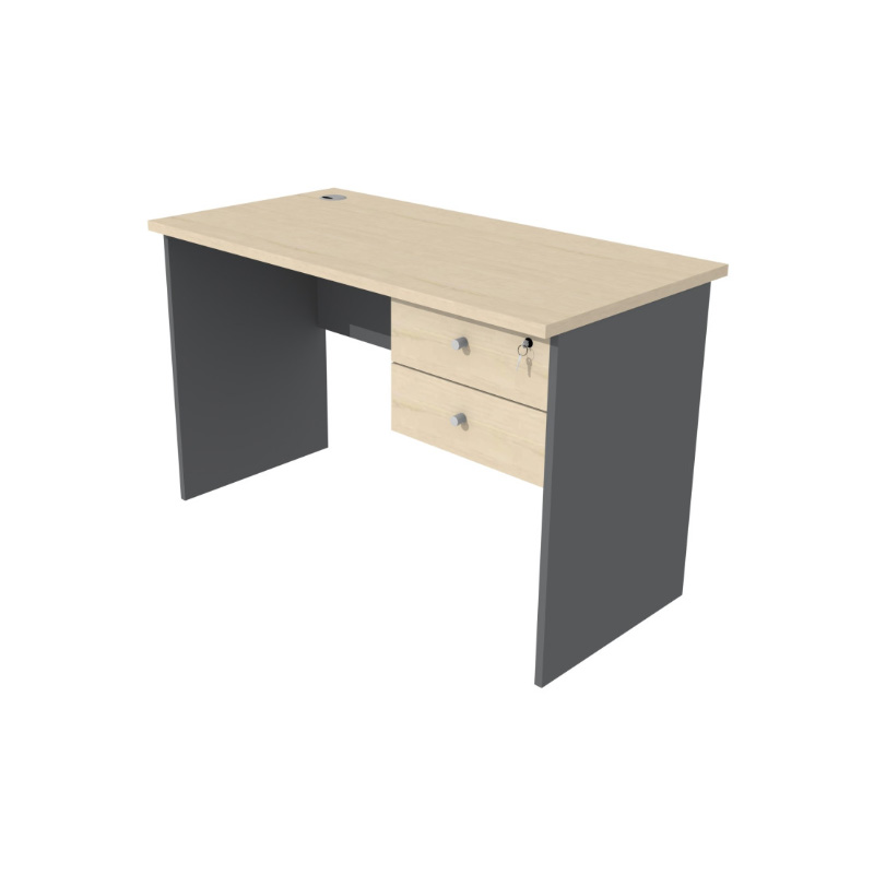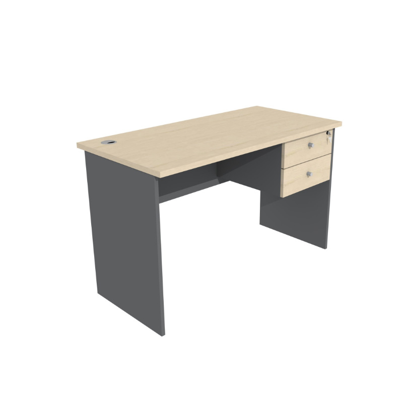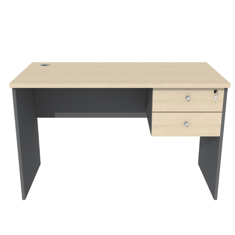 Escritorio Recto, con cubierta en Mdf melaminico 24mm, estructura Mdf melaminico 18mm, con 2 cajones con guía telescópica, con tiradores y cerradura trampa. Con pasacable. Color Grafito/Maple.