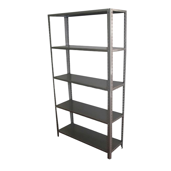 Estantería metálica mecano de Acero lamiando frio SAE 1010, con 5 bandejas metálicas lisas, con ángulos, pernos y tuercas para su armado. Con topes plásticos. Color Gris.
