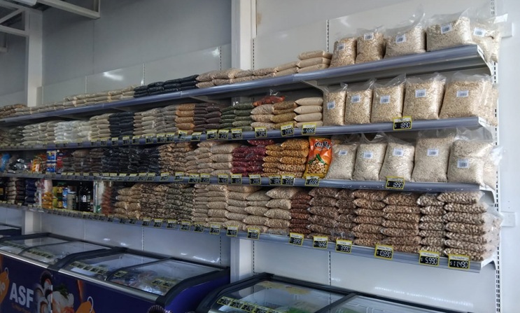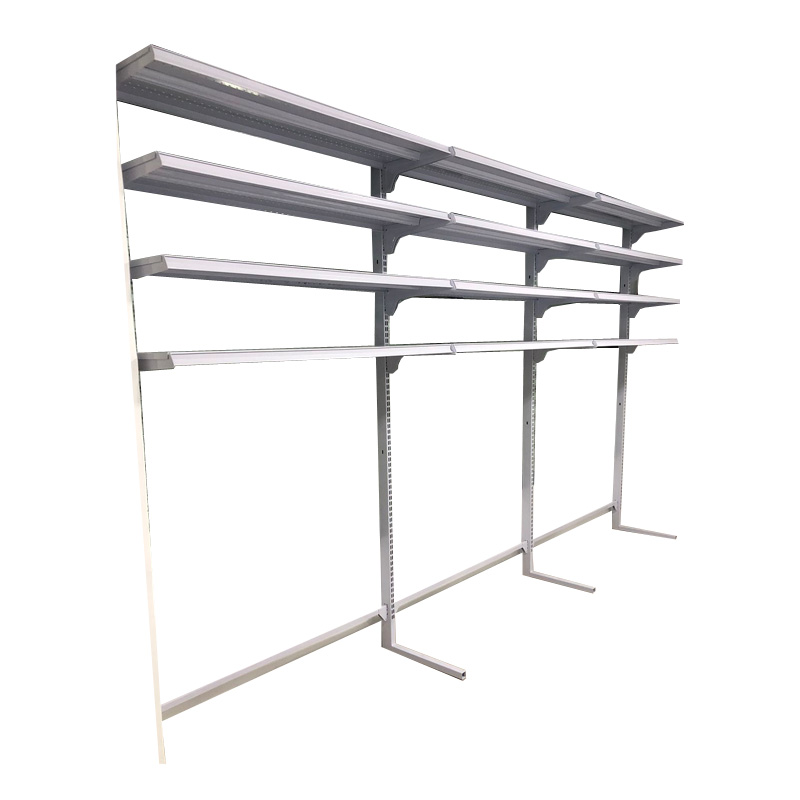 Góndola metálica mural sobre cooler con estantes superiores con porta precios plásticos.