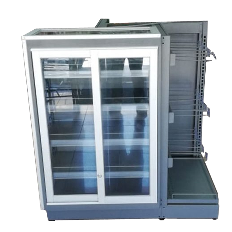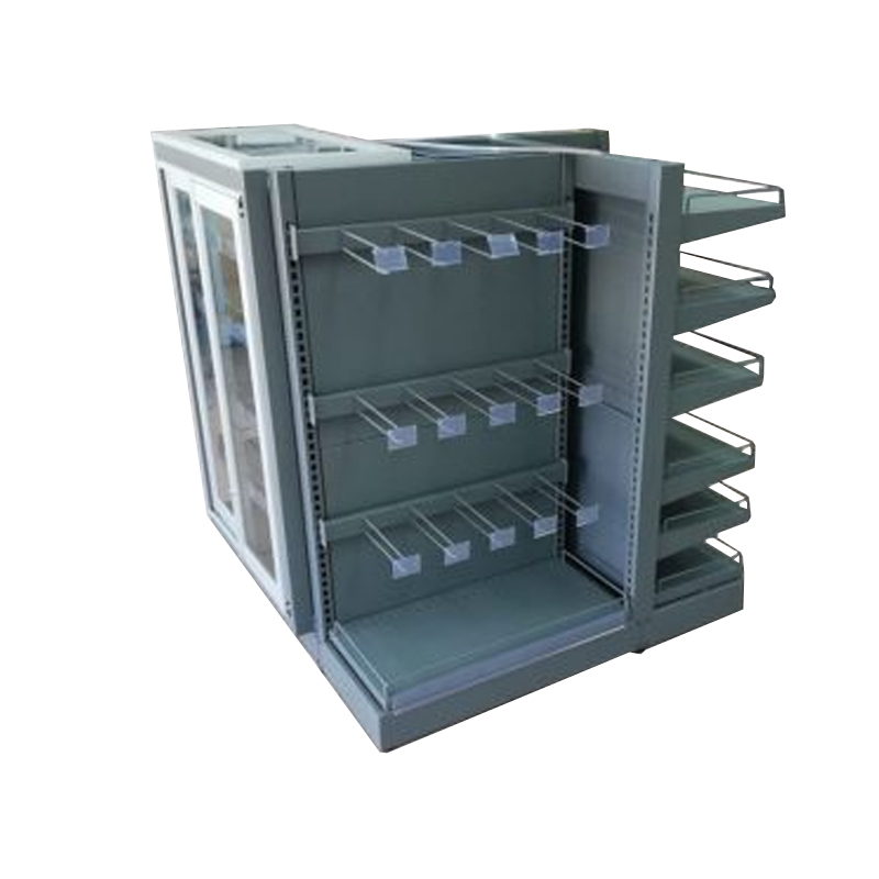 Góndola Especial 4 Lados. con estante base + estantes superiores con barandales frontales y laterales, con barrales con Gancheras, con Vitrina de seguridad con cerradura.
