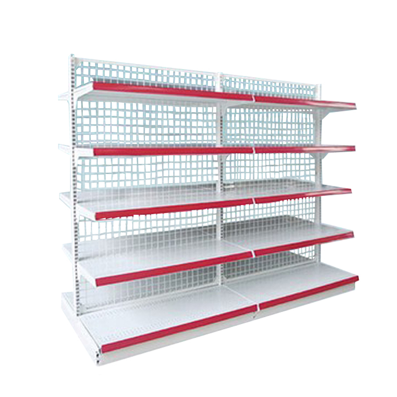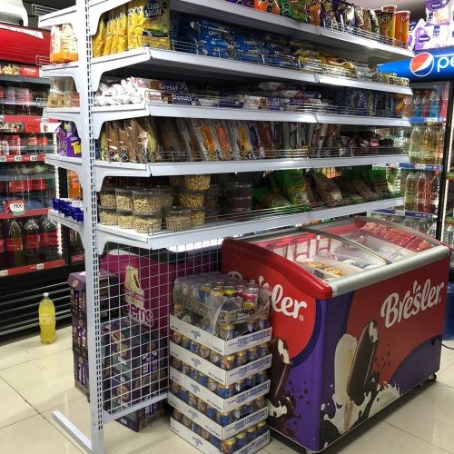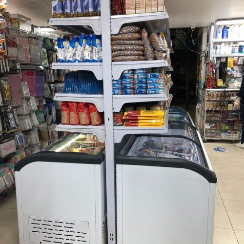 Góndola metálica central sobre cooler, con fondo de malla intermedio, con estantes superiores con porta precios plásticos.