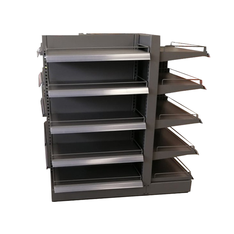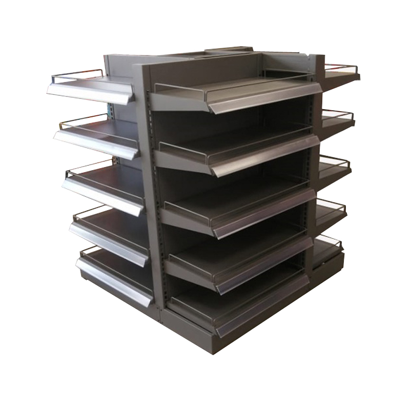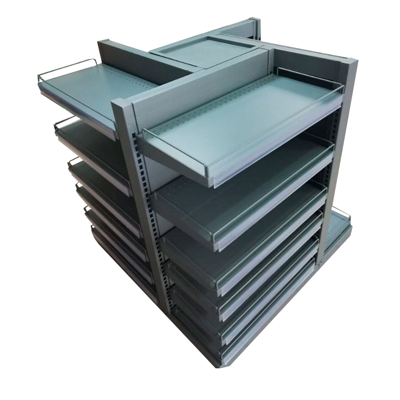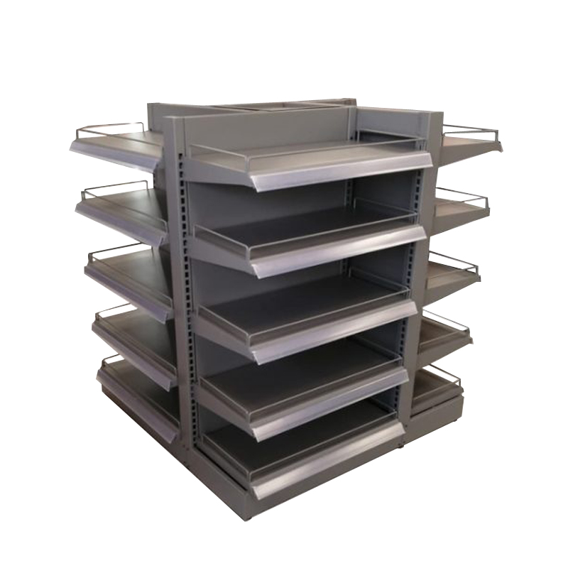 Góndola Especial 4 Lados, con estante base + 4 estantes superiores con porta precios con barandales frontales y laterales.