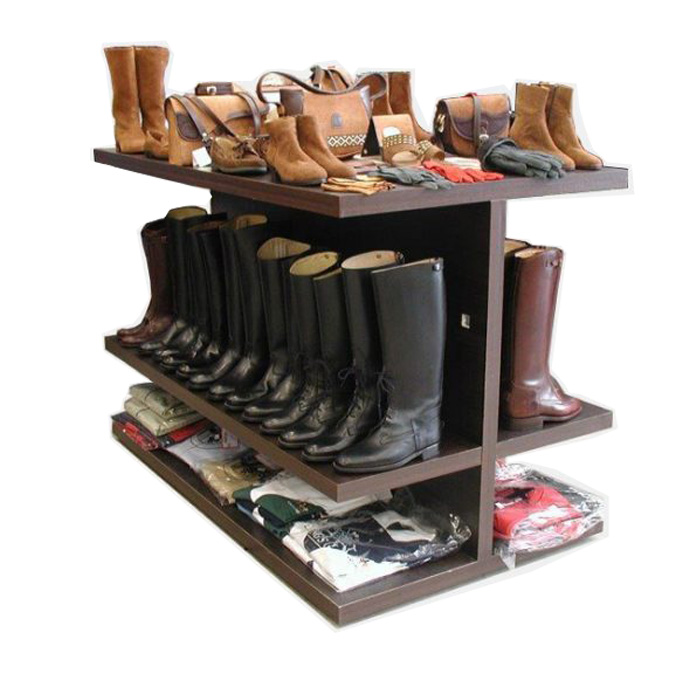 Exhibidor de madera, para uso en tiendas de zapatos, carteras y accesorios, con 3 niveles de estantes fijos en madera Mdf melaminico. Terminación laminado Color Chocolate. Con topes plásticos.
