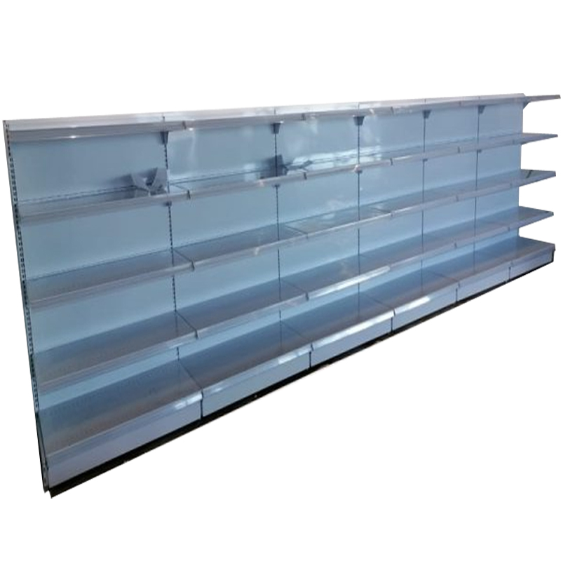 Góndola Mural Baja STD, para exposición de Cosmetería, Farmacia, Productos de Belleza. Con Estante Base + Estantes Superiores, Con tapa superior y porta precios.