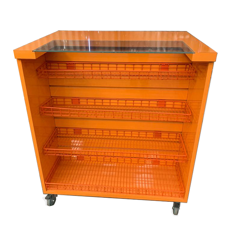 Mueble Caja Especial, con Canastos frontales escalonados, con 4 ruedas. Con cubierta mostrador vitrina. Con cajón para dinero y estante intermedio trasero. Color Naranja.