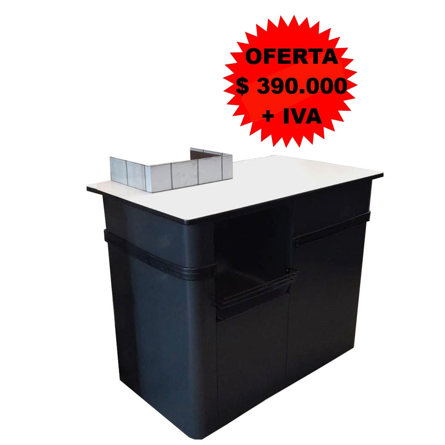Check Out Punto Rapido, estructurado con base de acero color Grafito, Con cubierta laminada color Blanco y porta bolsas frontal para entrega de mercaderia.