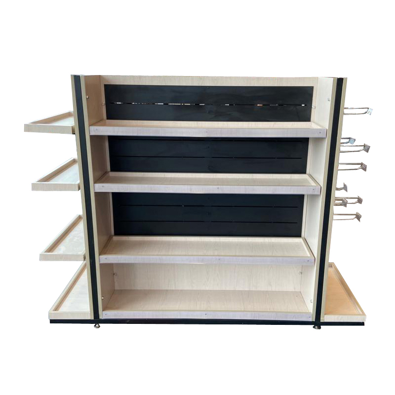Mueble Exhibidor Noon Food para venta impulsiva, Estructurado con perfil de acero revestido con placas MDF enchapadas y fondos de planchas metálicas ranuradas para montaje de accesorios. Con 6 bandejas centrales + 3 bandejas puntera + 10 gancheras con porta precios plástico. Con niveladores. Color Blanco Hueso.