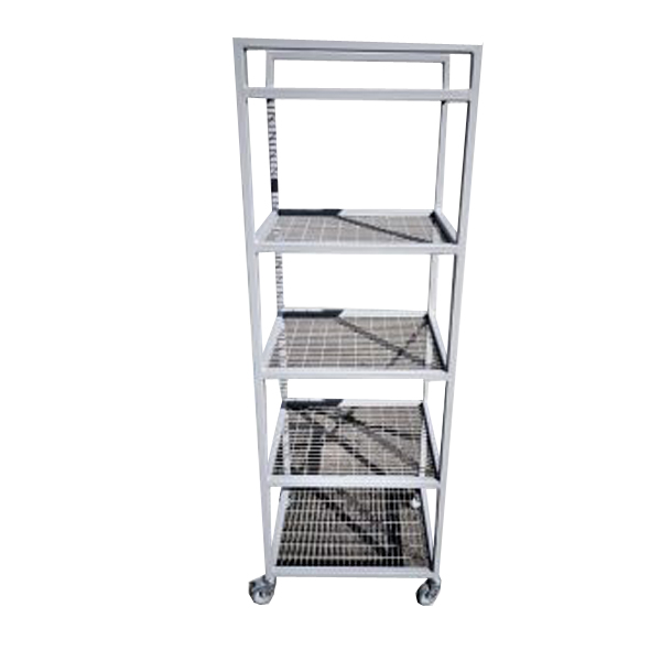 Estanteria móvil metálica para casinos, para traslado de mercadería, fabricado en acero perfil y malla acma, con 5 niveles con ruedas. Terminación pintura electroestática Color Gris