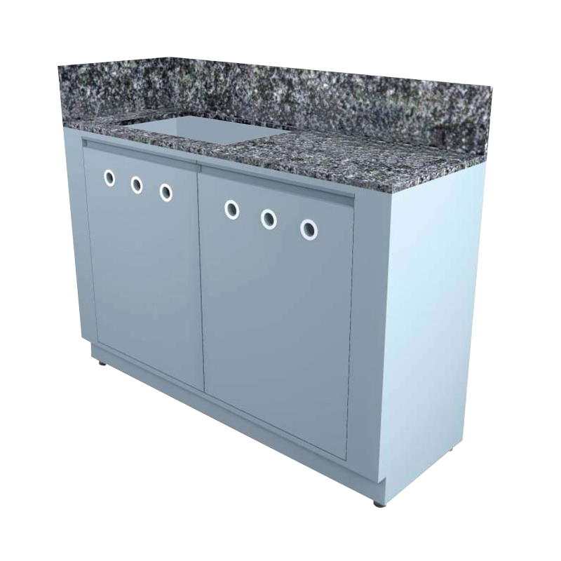 Mueble Mesón Postmix Auto atención, para uso en tiendas de conveniencia y comedores, estructurado en MDF laminado plástico color grafito, con cubierta, trasera y lateral de granito. Con patines niveladores.